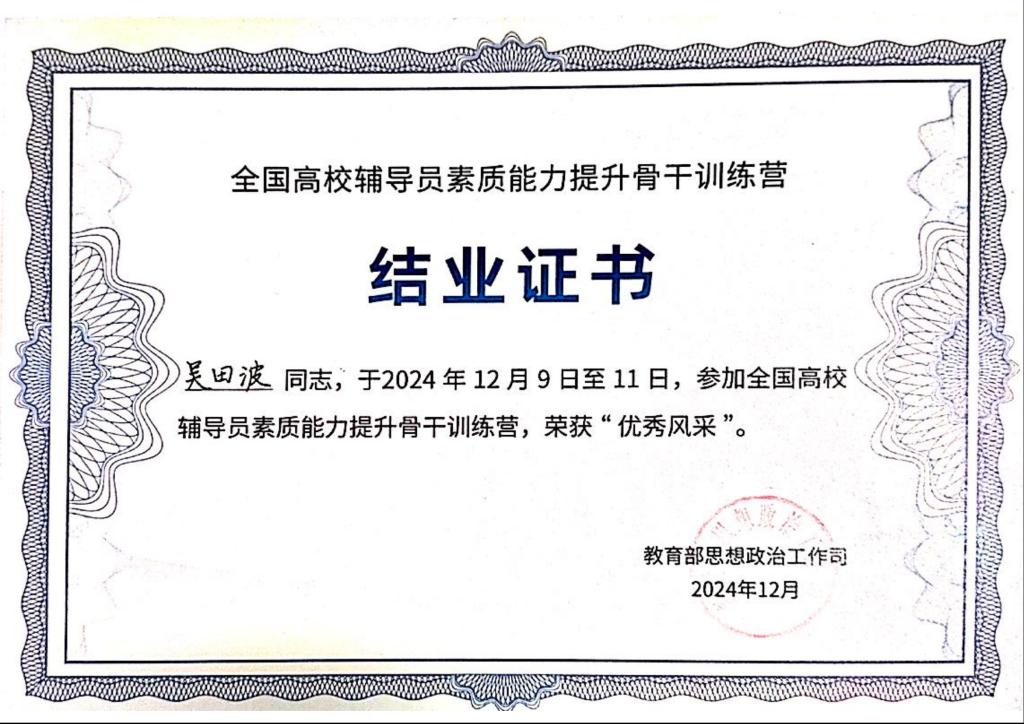 吴田波在2024年全国高校辅导员素质能力提升骨干训练营比赛中荣获“优秀风采”