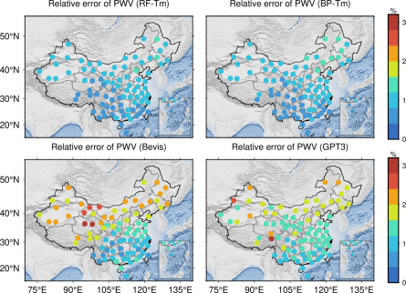 该论文针对GNSS水汽(PWV)反演中,大气加权平均温度(Tm)模型依赖实测气象参数且难以精确刻画其时空变化的问题,首次提出了融合盘古气象模型与随机森林算法的Tm实时预报方法,并构建了相应预报模型(RF-Tm)。该方法通过引入AI预报地表温度,并结合随机森林强大的非线性拟合能力,有效刻画了Tm在中国复杂地形下的时空变化特征。该模型在中国全域的验证结果表明,与传统的Bevis线性模型相比,均方根误差显著降低41.3%。与目前广泛使用的GPT3全球经验模型相比,精度提升达到了39.5%。相较于常用BP神经网络模型,新模型在精度与稳定性上仍有进一步提升,RMSE降低了2.8%。最终,该模型显著提升了GNSS反演可降水量的理论精度,使PWV反演的平均理论误差降至0.17mm,相对误差小于1%,尤其在青藏高原等传统模型表现较差的复杂地形区,改进效果最为明显,为实现高精度、无需气象观测依赖的实时GNSS水汽监测提供了可靠的数据支持。